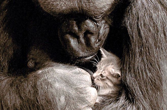 One of the best-known animals to adopt other species was the gorilla, Koko. Koko became famous for communicating with her people through sign language. She demonstrated an intelligence far in advance of what humans believed gorillas were capable of. Koko adopted a number of kittens in her lifetime. The most famous of these was the first, a Manx kitty whom she named herself: All Ball. After All Ball was tragically killed by a car, causing Koko clear and obvious grief, she adopted other kitty friends as well. Lipstick and Smoky, also Manx, were next. At the time of her death in 2018, Koko’s cats were Ms. Gray and Ms. Black. One of Koko’s caregivers adopted the cats after Koko passed away.
