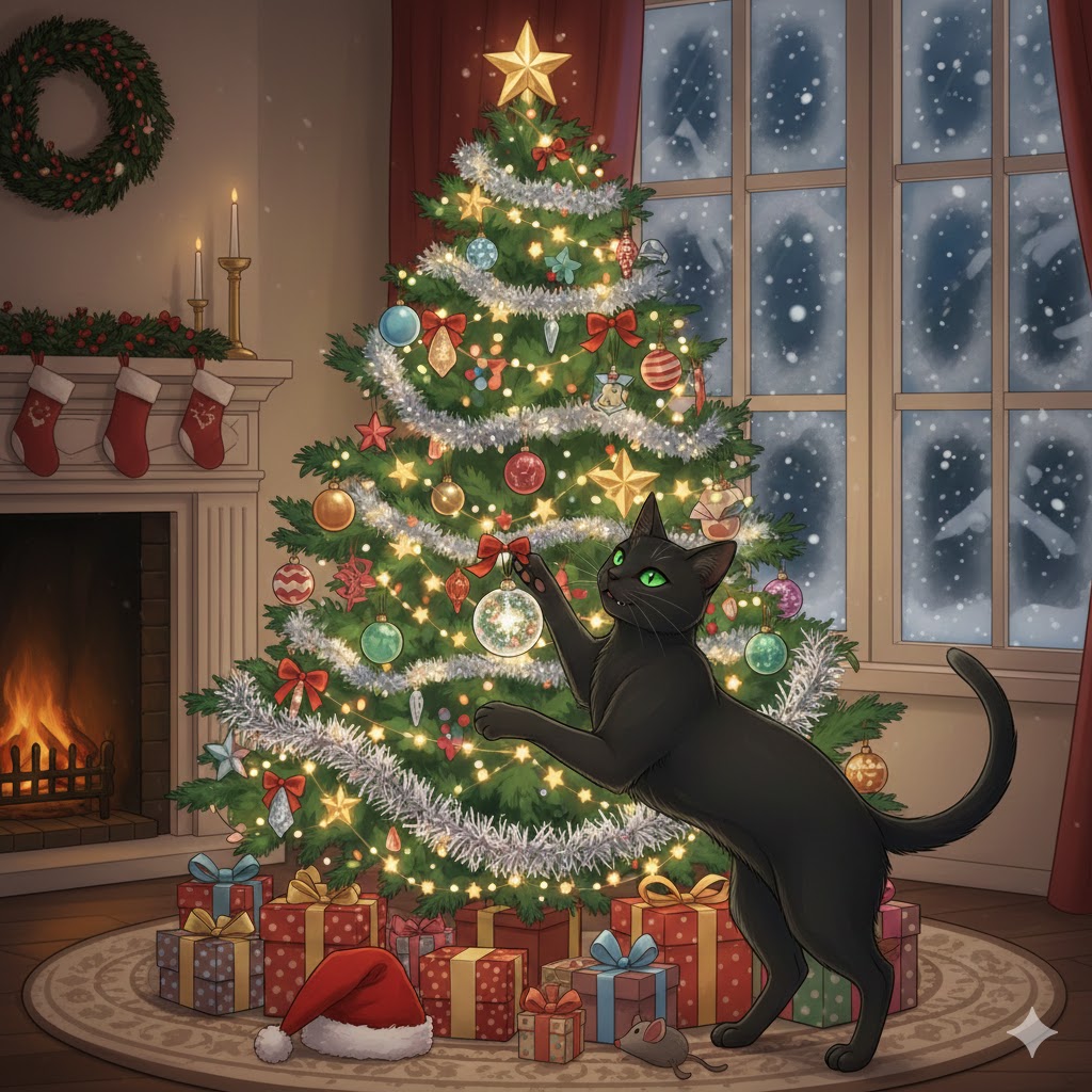 Our stunning black kitty, Magic? He was our 2023 Christmas present from Missie, who had crossed into spirit that November. He wasn’t trapped and brought inside, then a seven-month old kitten, till the day after Christmas (“Boxing Day” had a special meaning for him). He was then confined to a section of the house till after the tree came down. By the ’24 holidays, however, he was out and about. We did tuck him in at night, or if no one was home, but as long as I was here, he had full access to the house, the tree, the presents, the decorations. Sure, he checked out the ornaments, even tentatively batted at a couple of lower ones. I had to correct him if he was too curious about the wires (which, if I recall, only happened once or twice; Bitter Apple tastes nasty). Most of the time, if he interacted with the tree at all, it was just to lie handsomely in front of it, looking like a Halloween decoration that got its holidays mixed up.