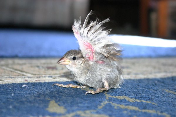 French Fry arrived in that same first rescue season as Stars and Stripes. She was a naked little nestling, only a few days old, and fell from the rafters of a riding arena. She landed in the sand right in front of a very kind horse, who stopped and refused to move forward until his rider dismounted and picked up the little bird. She took it to the farm owner, who told her to toss it in the manure spreader. Fortunately, the lady had a better heart than that, and gave me a call. When French Fry’s feathers came in, they were curly and frizzled, and she still has feather problems and cannot fly. As with many of the babies we receive, I am certain that she didn’t just fall out of the nest, but her parents disposed of her to save resources for the ones that would survive. Well, their loss is our gain. She received her name because my daughter, when she was little, used to call the sparrows that begged for scraps in the McDonald’s playground “French Fry Birds”.