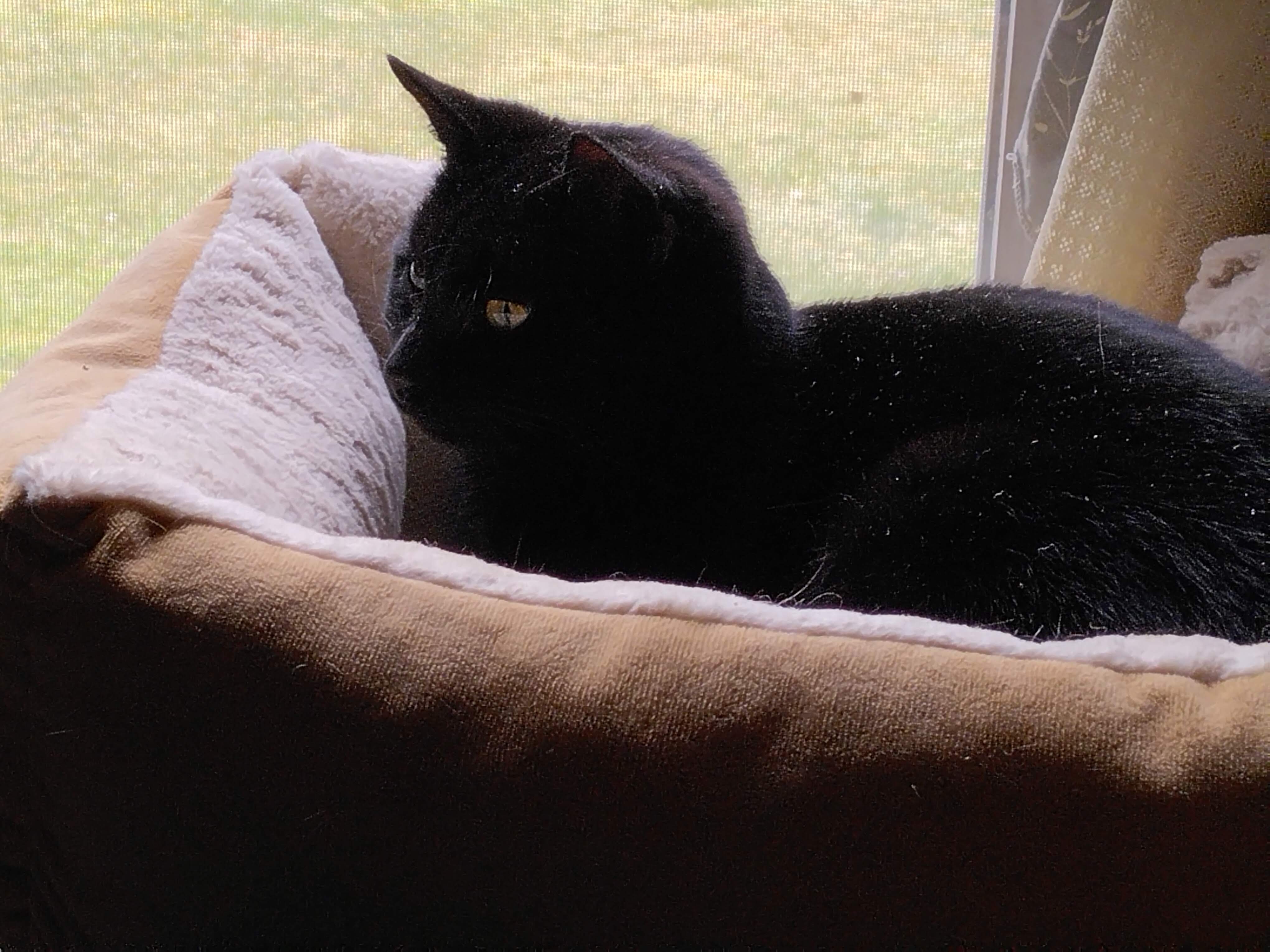 Shortly after Missie passed away, a black kitten showed up in our barn. Living in the hills, surrounded by forest, and with a barn on the property, I guess our home seemed like a good place to dump an unwanted cat. I call karma down on the heads of those people. Their loss is our gain.